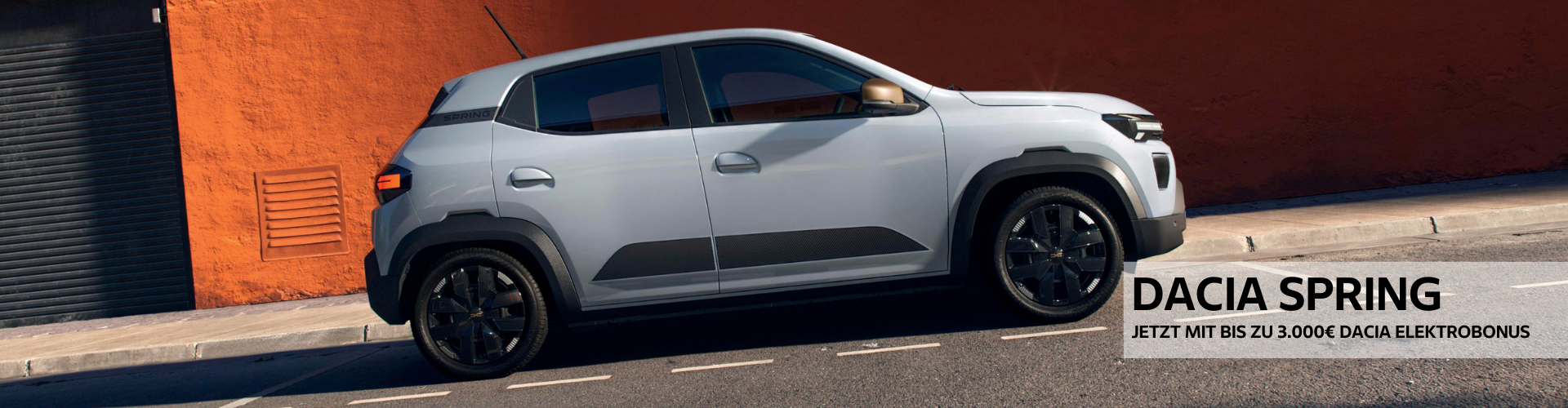 ¹ Elektrobonus i. H. v. 3.000 € (brutto) von Dacia für Privatkunden und Kleingewerbe bei Finanzierung eines neuen Dacia Spring über Mobilize Financial Services sowie 2.500 € (brutto) bei Barkauf. Gültig für Dacia Spring bei Kaufantrag vom 16.02.2026 bis 31.03.2026. Die Erstzulassung muss spätestens 30 Tage nach Anlieferung beim Händler erfolgen. Bei Finanzierung darf die Anzahlung maximal 70 % des Kaufpreises betragen. Nur solange der Vorrat reicht. Der Elektrobonus ist unabhängig von einer staatlichen Elektroprämie.